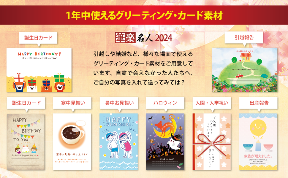 筆楽名人2024は引越・結婚・出産報告など様々な場面で使えるグリーティングカード素材を用意しています。