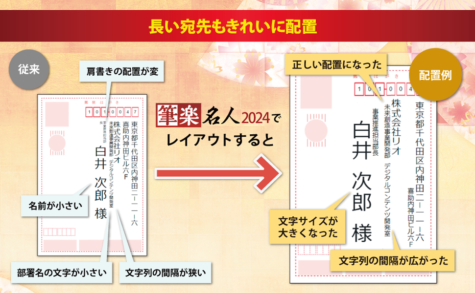 筆楽名人2024は住所・会社名・部署名・肩書・名前が個別に分かれているので長い住所、長い会社名、